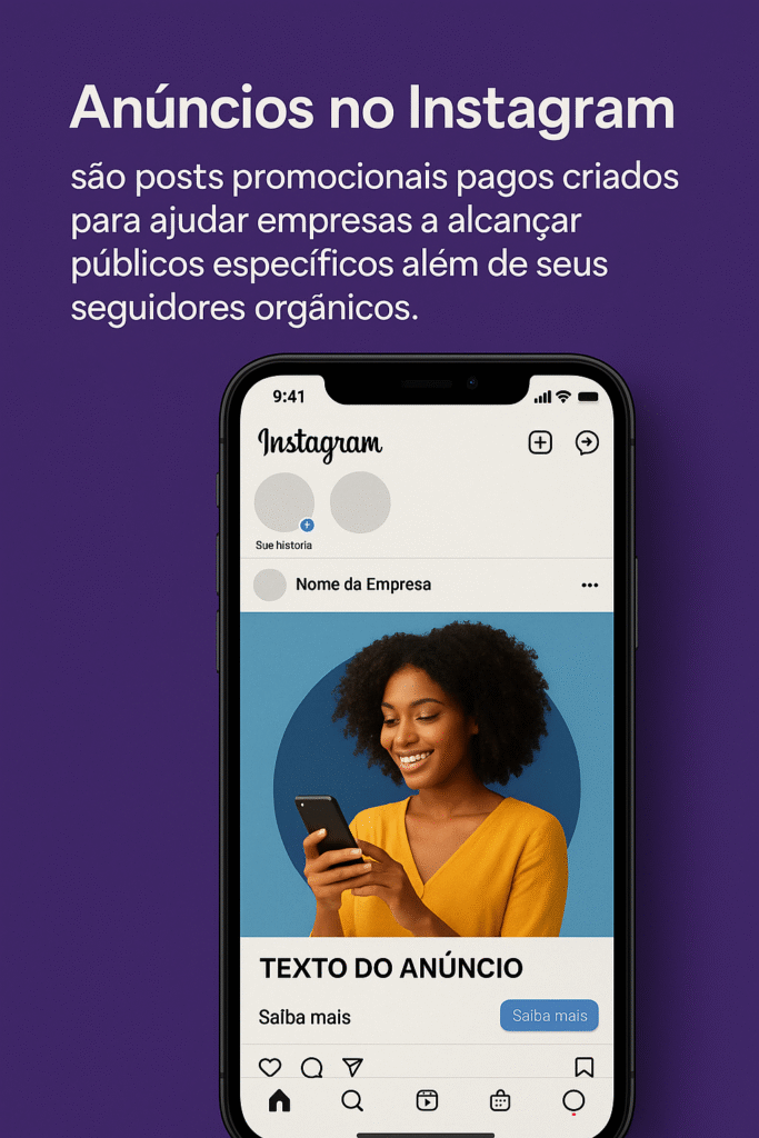 Anúncios no Instagram são posts promocionais pagos criados para ajudar empresas a alcançar públicos específicos além de seus seguidores orgânicos. Esses anúncios pagos aparecem de forma natural em toda a plataforma: no Feed do Instagram, nos Stories, nos Reels, nas páginas Explorar e até nas abas de compras. O objetivo é simples: conectar marcas com pessoas que têm maior probabilidade de se engajar, comprar ou tomar uma ação.