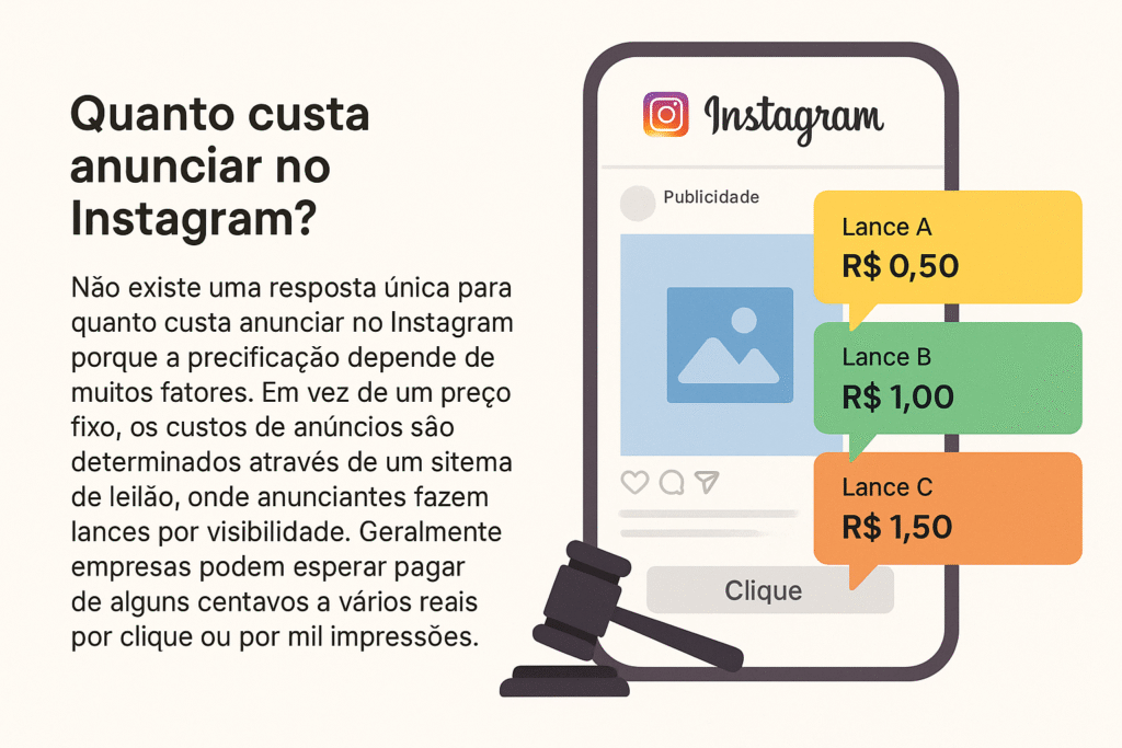 Não existe uma resposta única para quanto custa anunciar no Instagram porque a precificação depende de muitos fatores. Em vez de um preço fixo, os custos de anúncios são determinados através de um sistema de leilão, onde anunciantes fazem lances por visibilidade. Geralmente, empresas podem esperar pagar de alguns centavos a vários reais por clique ou por mil impressões.