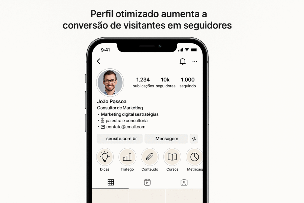 Seu perfil do Instagram é como seu cartão de visitas digital. Se novas pessoas encontram seu conteúdo mas seu perfil não está otimizado, elas podem não clicar em “Seguir”. Para aumentar alcance no Instagram e converter visitantes em seguidores: